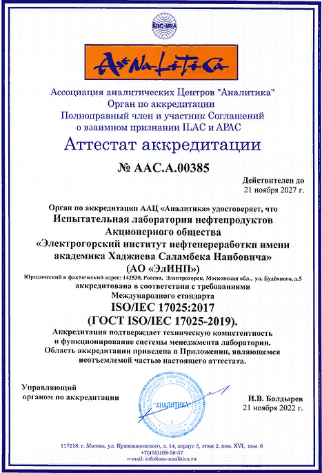 АТТЕСТАТ АККРЕДИТАЦИИ №ААС.А.00385 ДЕЙСТВИТЕЛЕН ДО 21 НОЯБРЯ 2027г.